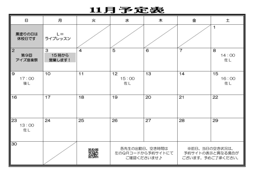 金山校11月ライブレッスン予定表・休校日のお知らせ