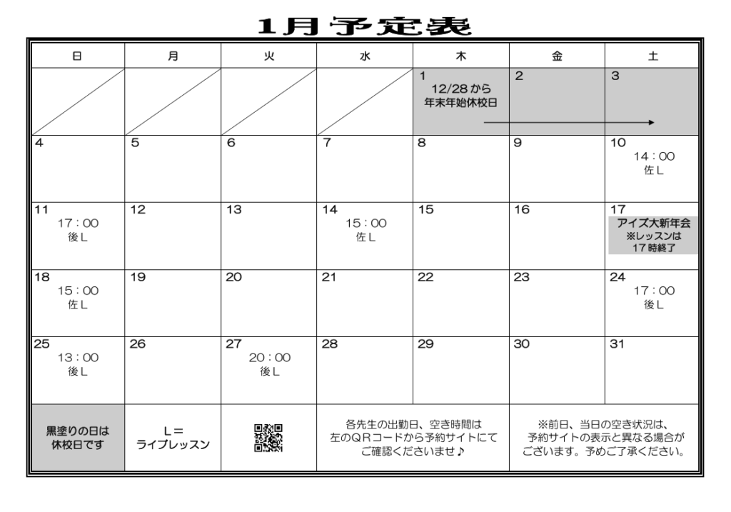 金山校2026年1月ライブレッスン予定表・年始休校日のお知らせ
