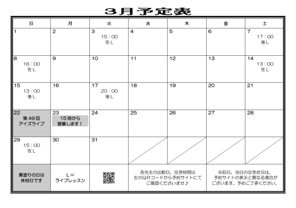 金山校3月ライブレッスン予定表・休校日のお知らせ